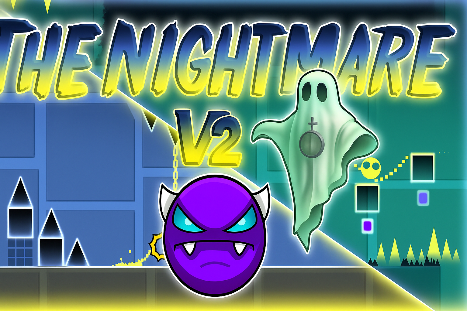 Geometry Dash The Nightmare V2 is a redesigned version of the original The Nightmare screen in Geometry Dash. You control a geometric block that automatically moves, and you just need to jump or block the obstacle. The game is designed with precise time zones, water jets or gravity gates, wave sections, and tight jump ropes. If you violate the time, you have to start over.